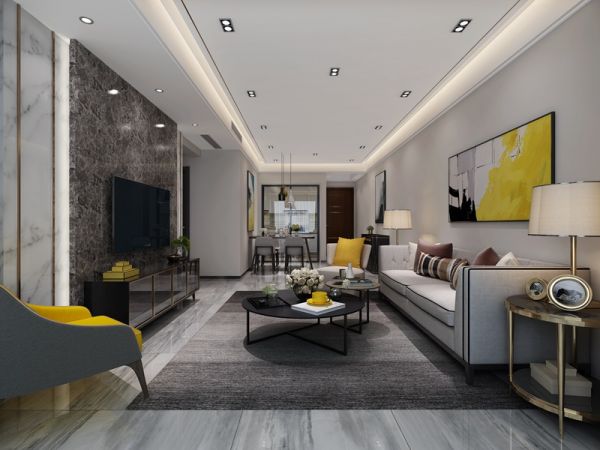 客厅以白色为主基调,局部区域用黄色辅助,色彩的错落有致瞬间拉开了大空间的视觉层次。天花没有选择传统空间中的主灯——吊灯,而是采用点、线组合的辅助光为空间提供光源,营造出的视觉效果也更加柔和。