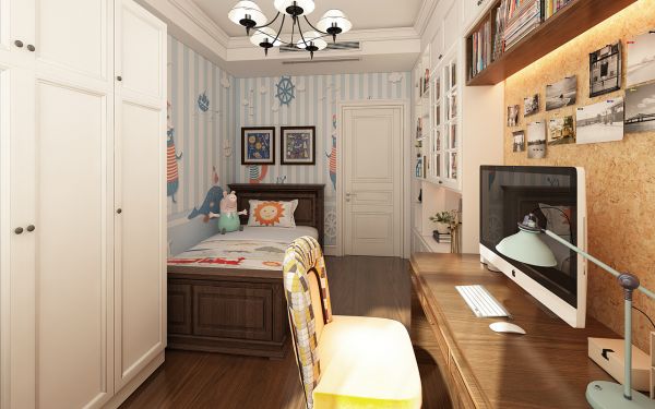 儿童房里也设置书桌、书柜等,给孩子一个独立的自我空间。浅蓝色的背景色优雅清新,混搭活力的卡通挂画。