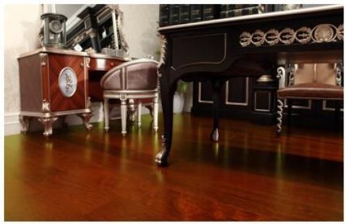 印茄又叫菠萝格,其木材剖面微具光泽,边材呈淡黄色,芯材呈暗红色,具有深色带状条纹,木纹中有黄色物质,形成肉眼可见的金线,似有阳光点点缀落其间。印茄木制成的地板以红色为底,细看略显金丝,使得整个地板更加高档有质感,但是这种华贵感却并不夸张,只是恰到好处地给你低调奢华的感观。