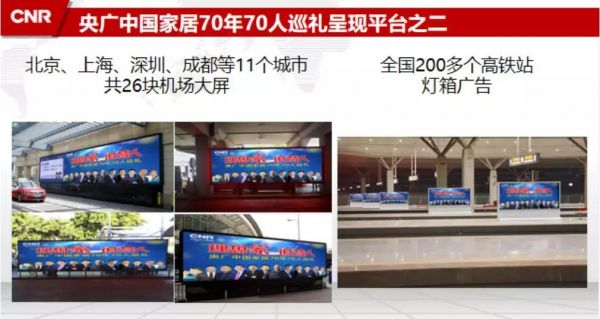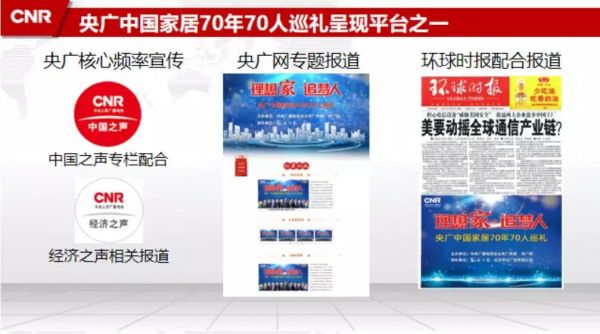 本次活动将以中央重点新闻网站——央广网家居频道为宣传主阵地,通过记者走进各大家居企业实地采访等方式,运用包含广播、互联网和移动客户端等在内的央广融媒体资源以及《环球时报》、全国200多个高铁站灯箱和11个城市26块机场电子大屏等户外媒体对巡礼活动进行广泛传播。
