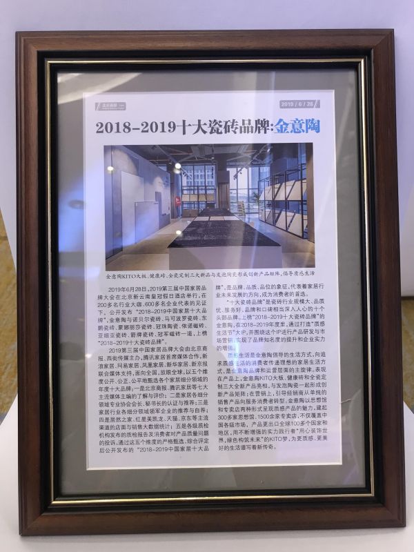 2019年6月28日,由北京商报、西街传媒主办,新京报联合媒体支持的2019第三届中国家居品牌大会在北京新云南皇冠假日酒店举行,在200多名行业大咖、600多名企业代表的见证下,“2018-2019中国家居十大品牌”隆重揭晓。金意陶再次蝉联该奖项,与同行业共10家建陶企业榜上有名,与国内外优秀家居品牌一起,共同为国人缔造有质感的生活空间。