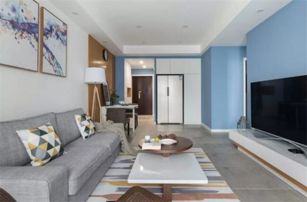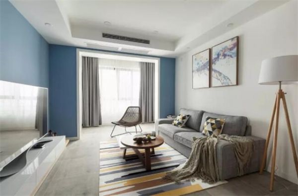 客厅墙面通过白色与灰蓝色的经典搭配营造出现代简约的理性之美。