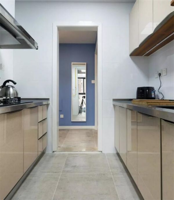 厨房的空间十分有限,因此平行橱柜的的设计极大地增加了台面的利用率和储物功能,也很好的留出了操作通道。