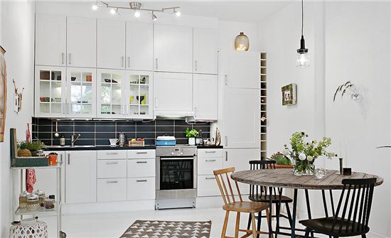 吊柜的高度,底部在1米6左右比较适合,这样就算开吊柜的门也不容易撞到头。上翻门好看但不一定实用,对于身材娇小的女性来说,打开上翻门之后不一定能够得着把手。