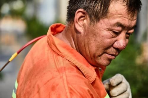 为了道路的清洁保障,历师傅每天六点半就清扫完毕并进行收尾工作。我们之所以能在干净的道路上快步前行、准点上班,是因为这些我们不见其人、跟我们有着工作“时差”的“透明人”提前把道路上的各种果皮垃圾、宠物粪便打扫干净。而当我们进入九点后开着空调的办公室时,他们却又低调的清扫起早高峰后的道路垃圾。38℃的天气和近60℃的地表气温,他们身处热浪,除了腌眼睛的汗水还有后脖子上红黑色的爆皮,而工服上一早结下的汗碱再次被汗水浸透消失。