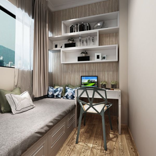 本案多功能房户型狭长,所以选择的榻榻米尺寸要稍小于普通榻榻米,出来的效果更像是卡座。虽然尺寸偏小,但完全可以hold住一个人在学习工作后的休闲一躺。