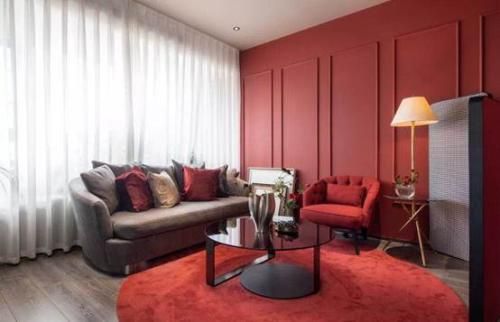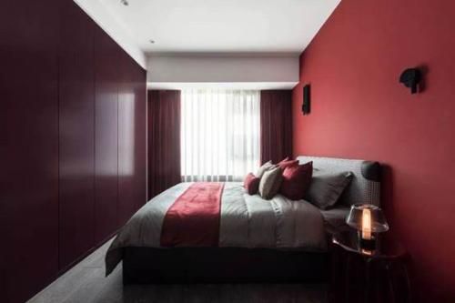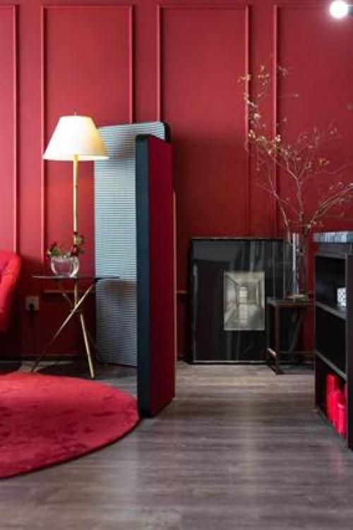 整个住宅户型方正,面积不到100㎡,三室一厅双卫。客厅和主卧色彩基调介于玛萨拉酒红与朱红之间,而从客厅到主卧的直线上,设计师塑造了一个全透明的空间作为多功能室使用;类型多样的软装则丰富了空间色彩层次,同时也中和了原本秾烈的主色调。