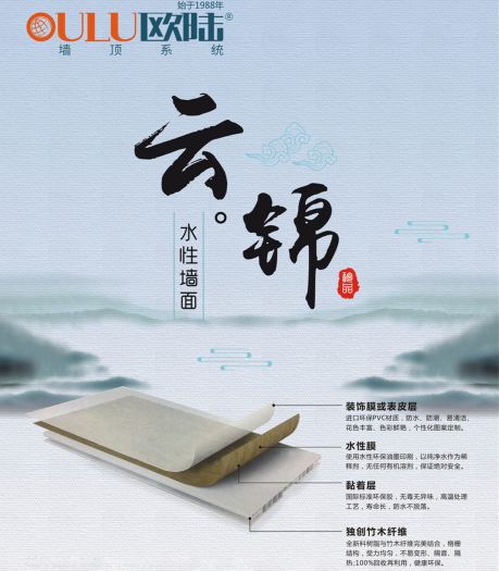 欧陆美居云锦系列水性膜集成墙面,采用“装饰膜或表皮层+水性膜+黏着层+独创竹木纤维”结构。