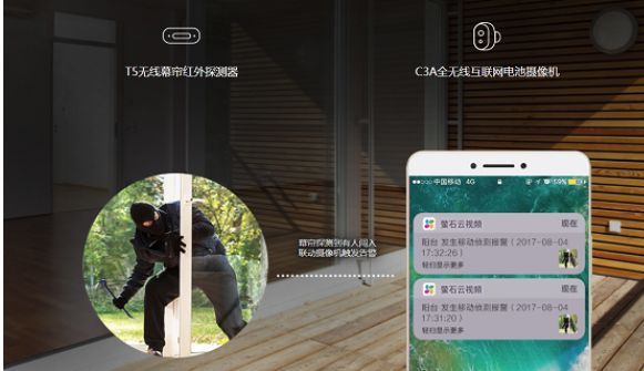 有小偷从窗外闯入时,将触发无线幕帘红外探测器的告警系统,你可以通过萤石云视频APP查看智能摄像机拍摄的实时画面,及时报警。