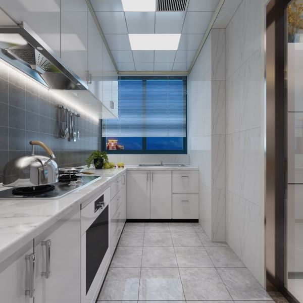 从橱柜可看出,厨房大篇幅地使用了乳白色,因为设计师考虑到厨房开窗非朝阳面,沿用客厅的灰色系难免会造成室内暗沉,且有压抑感。干净的乳白可给人营造清爽明亮的视觉观感,而且还方便对家庭卫生有着极高标准的女主人做清洁。