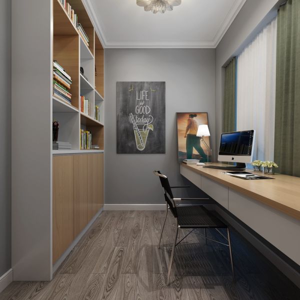 现场量尺后找厂家定制的原木色书桌,下方抽屉处用乳白做了跳色,桌子的立体感自然就出来了。书桌靠窗放置可有效利用自然光源,搭配麻布材质的橄榄绿和米白色窗帘,厚薄不一的窗帘造型让业主可根据不同天气情况进行选择。