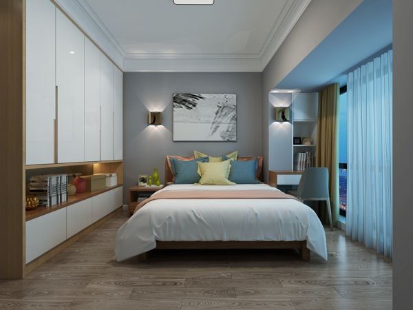主卧与长辈房沿用了本案的主打色。用灰褐色木纹砖取代不怎么好打理、且不好保养的实木地板,既极大地降低了装修预算,又不失原本想要的空间气氛,算是一种高性价比的选择。