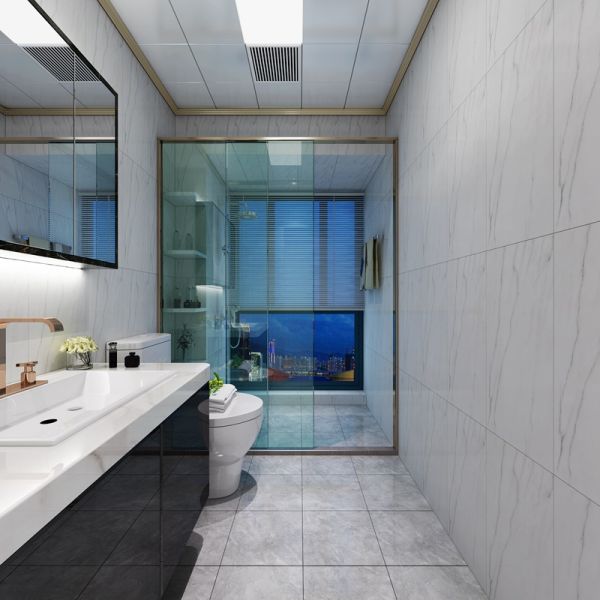 主卫做了瓷砖上墙,有效延伸了浅灰色地砖的清爽气息。干区和湿区用玻璃隔断开,通透的设计可以发挥中高层住宅的观景优势。玻璃四周用黄铜收边,与天花吊顶的黄铜收边照相呼应,空间也多了几分精致感。