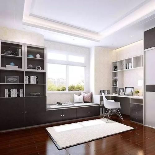 靠窗位置的矮柜与转角书桌柜无缝衔接,通过书桌将90度的转角利用起来,书桌与衣柜紧密链接,这个阅读办公区就变成一个非常私密的小空间,非常容易让人进入学习和工作状态。