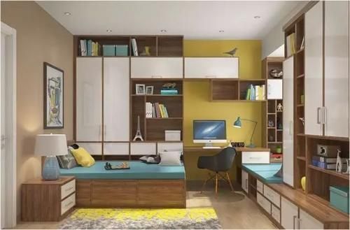 墙面不大,又想在卧室实现阅读办公功能,那就把转角利用起来,通过延伸设计的方法,让小卧室的功能更加齐全。靠近衣柜一侧的书桌下方可隐形收纳,减轻卧室储物负担,书桌上方做展示,让小角落更有美感。