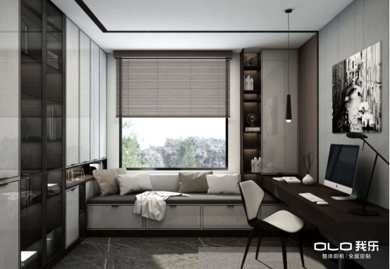 榻榻米、吊柜和书桌组成的L型空间,一次性可以满足休憩、储物和工作三大功能,同时也可以让整个空间显得整洁开阔,打破传统书房设计逼仄杂乱的局面。
