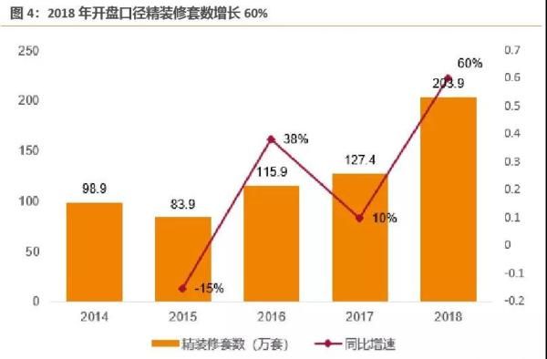 精装修比例提升趋势明确,2018年精装修套数提升60%,保障相关企业未来收入快速增长,如大宗渠道占比高的江山欧派。