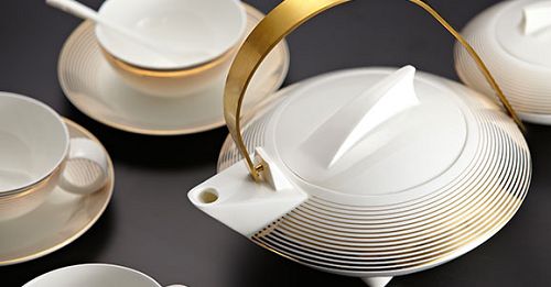 这款“腾飞”茶具由我国著名陶瓷艺术家、中国陶瓷艺术泰斗、清华大学美术学院张守智教授领衔设计。简洁的线条营造出向上腾飞的造型,凝脂般的白色加上环状烫金效果,尽显“腾飞”茶具的高贵气质。同时,该款茶具限量发行,具有极高的艺术和收藏价值。