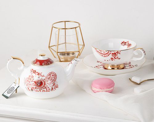 嫣红欧式下午花茶壶套装,采用优质骨瓷为原料,质地轻盈,手感温润如玉;再加上水晶镶嵌,晶莹剔透,缤纷闪亮;同时,产品全手工描金,笔触细腻流畅,轻柔曼妙,宁静中尽显唯美。