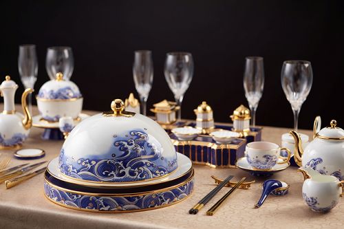“海上明珠”取鼓浪屿、万国建筑、贝壳、海浪等厦门当地的符号入产品设计元素,运用大面积的描金,选择了古代陶瓷上经典的海浪作为主要的视觉元素,用直观方式体现了中国的历史感和神秘感。