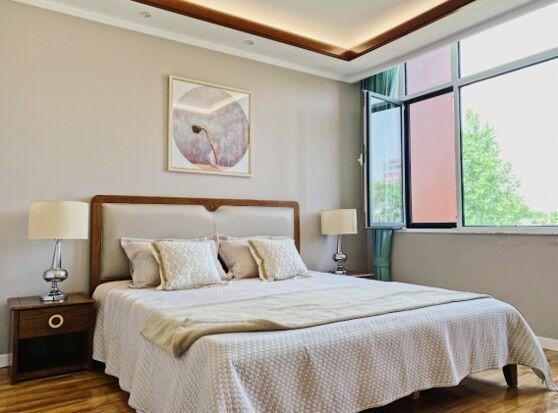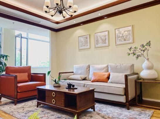 这款“闲庭落英”虽不是借鉴“长安”之配色,但亦有着异曲同工之妙。在色彩搭配设计上也很突出,采用了简单的理石白色与深棕实木两种高雅又暖意的色彩进行搭配,既有古香古色的中式感,又有清新淡雅的现代意境,展现出亦古亦今,典雅而时尚的层次美感。而且,这套新中式家居采用整屋北美进口白蜡木家具,其外观颜色与欧洲槐木相似,圆润而有光泽,还耐腐朽,造型的运用力求简单流畅,但又融合着精雕细琢的意识,在保留传统元素的神韵前提下,从设计形式上进行简化,摒弃繁冗复杂的装饰技巧,整体造型以简洁明朗的直线线条为主,纹路也更加清新自然,既有传统中式家具的艺术气质,还充满了现代的时尚气息。