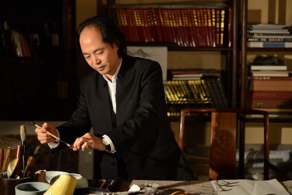 中国木雕艺术大师、大清翰林创始人吴腾飞大师正在作画