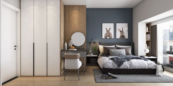 主卧拥有宽敞的过渡区,所以石工在进门左侧增设了顶天立地的储物衣柜,并腾出一个小空间用来放女主的梳妆台。梳妆台背靠的地方同样做了衣柜,装下小夫妻俩的一年四季so easy~