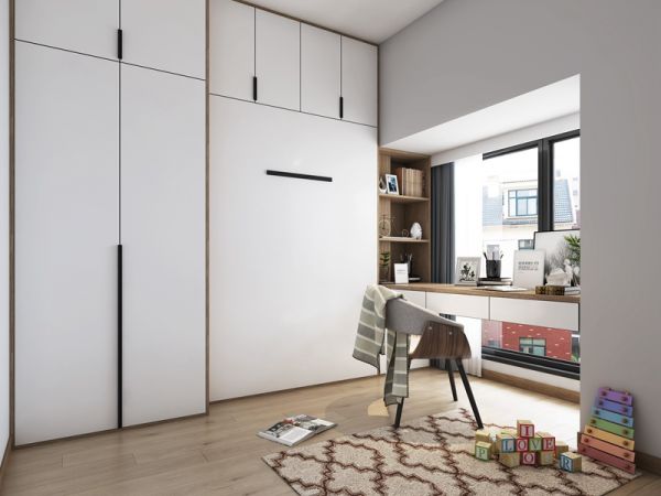 多功能房集看书休闲、儿童玩耍、储物收纳多种功用于一体,石工选择突出表达空间的储物性能。他与男女主讨论后,决定在进门左手侧设置顶天立地的储物柜,靠窗那一侧占了80%的“柜体”其实是一个伸缩床,需要使用时只需拉下床板。