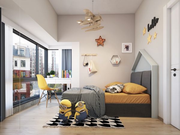 儿童房的马卡龙色床头造型,引出这个空间的童趣,墙面没有贴花哨的墙纸,仅采用多功能造型置物架点缀,可满足小朋友的日常储藏、展示玩具等需求。