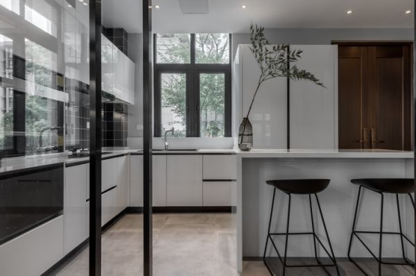 空间功能拆改及划分主要表现在一层,入户房型南北通透,没有任何遮挡,而且中厨太小,家庭氛围营造不够,于是邵思淇将房子的整个北边入户区域改造成一个大的中西厨,用隔断及移门增加通透感。不管是制作美食还是用餐,都可以欣赏到院子里的风光,变成了家居生活最重要的一部分。