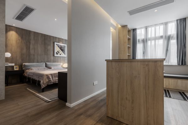 二楼主卧为增加功能性和舒适度采用了套间的处理方式,邵思淇为男女主人各自设计了一个专属的衣帽间,与休息区用隔断相连,女主人的衣帽间的飘窗不管是独自阅读或者品茗都会带来惬意的体验。整个空间从墙面到地面、衣帽间全部采用原木材质,为卧室空间带来了自然温馨的气息。女儿房运用了浅蓝色的背景墙与灯带结合带来了温柔浪漫的气息,橙色的窗帘充满活力,形成了冷暖对比,增加了空间的光泽。