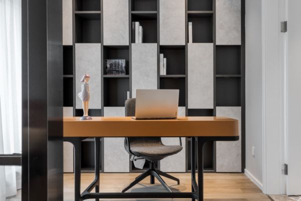 书房规划了整面墙的落地书柜,让空间更加宽敞,也最大限度地增加了收纳空间。浴室从地面、浴缸的大理石到墙面全部采用了灰色,不同材质与纹理,深浅不一,丝毫不拖泥带水。
