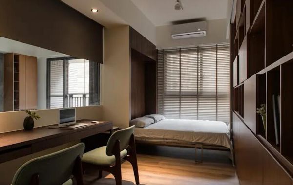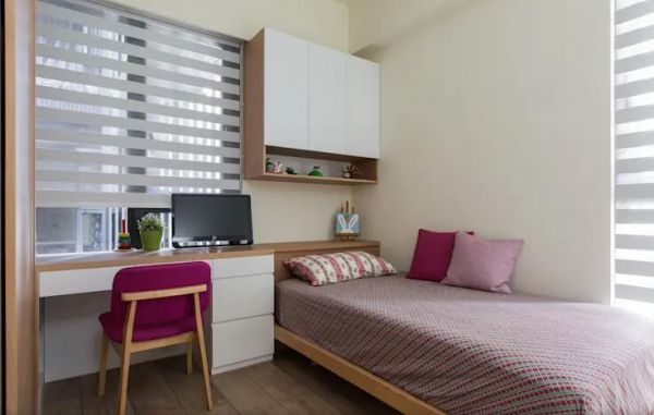 小空间里头必须集思广益,找出最高效能的设计方式。在这间小卧室里头,设计师选择书桌延伸成床头,结合两种机能,简单却实际。