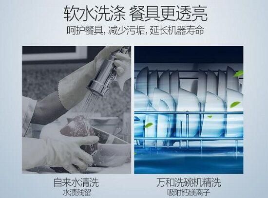 烘干,抚摸每一道餐盘的泪痕 洗碗的过程中有许多肉眼不可见的细菌,同样的,沥干过程中也会存在许多不可见的斑痕水渍难以消除,这就给了细菌污渍可乘之机。而万和洗碗机采用的是全密封热风循环烘干,每次洗完之后,就有约73℃的热风导入,循环工作,高温蒸发水渍,强制排走水汽,消除可能导致污染物聚集的水分残留。而且洗碗机使用的洗碗盐,富含大量离子交换树脂,可以有效吸附水中的钙镁离子,改善水质,减少餐具损伤,增加餐具的使用年龄,配合着烘干热风,令洗后的餐具光亮如新。