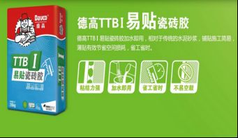 相信提到德高瓷砖胶,大家的第一印象就是德高的TTB系列瓷砖胶,其实德高TTB系列瓷砖胶有四款产品,分别是德高TTB I易贴瓷砖胶、德高TTBI+防霉易贴瓷砖胶、德高TTB II 大砖瓷砖胶和德高TTB III 快干瓷砖胶。从TTBI型到TTBIII型,型号越高,粘结力越好,可以粘贴的瓷砖尺寸也越大。此外,德高瓷砖胶全线产品包括TTB系列产品都取得三星绿色建材、十环及法国A+环保认证,保证了产品从选材、制造到应用,始终做到绿色环保,全面呵护大家的身心健康。