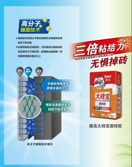 德高大砖宝瓷砖胶,它的性能指标为C1T,与TTBIII性能相近,可使用的砖型也与之相同。那么它与TTBIII区别在哪呢?德高大砖宝瓷砖胶并不具备TTBIII瓷砖胶的快干性能,但是它具有自己独特的技术——高分子锚固技术,能形成超强粘结的高分子聚合网,从而具备优异的抗下坠功能,并且在基面与瓷砖间形成分子作用力,像抛出的船锚一样将瓷砖胶紧固在基材之上。