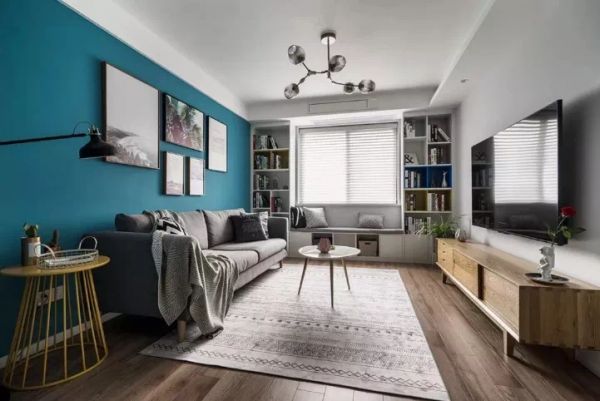 整个客厅给人一种简洁大方的感觉,孔雀蓝的背景墙上点缀几幅挂画,沙发、茶几、边几和电视柜都是简单利落的造型。灰色的电视背景墙上没有任何装饰,更显简洁感。靠窗的地方被改造成了飘窗休闲区,飘窗的两侧做开放式