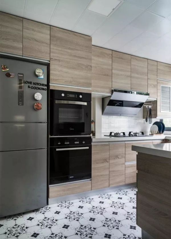 厨房选择了木质的橱柜为主色,地面铺设创意花砖,墙面是小白砖,冰箱和一些厨房电器都被嵌入了橱柜当中,更加有整体感。