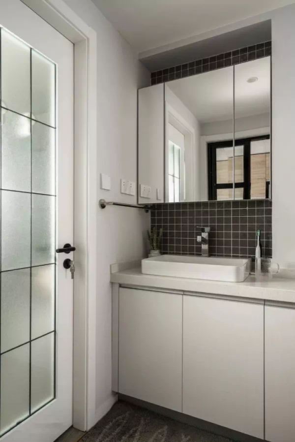 卫生间干区墙面贴了黑色方格砖,搭配白色的浴室柜,黑白的对比更显干净整洁。而一扇磨砂玻璃门,丰富了采光又保证了足够的私密性。