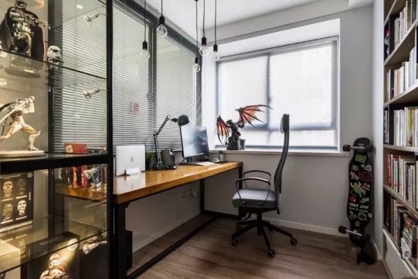 书房内部摆放了许多装饰品,嵌入式的书架和玻璃展示架都有,还加上了藏光的设计,让这个书房空间变得更为时尚与有趣。
