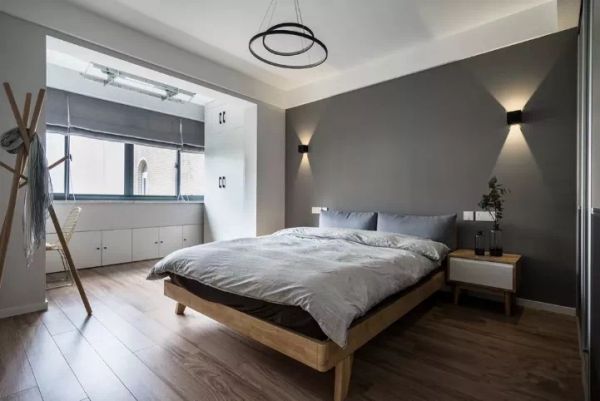 主卧室的床头背景墙刷了深灰色,左右两侧对称的壁灯和顶部的创意吊灯,带来格调满满的感觉。主卧和阳台之间不做隔断,阳台上做了许多收纳的设计,宽敞而又实用
