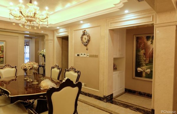 在餐厅的设计中,优美的弧形线条的餐桌和椅子,将宫廷般的优雅之美呈现出来,吊灯与餐桌中间的花卉完美对称。优雅拼花瓷砖与地面高贵的大理石瓷砖完美融合,将欧式的奢华、大气的感觉淋漓尽致地表现了出来。