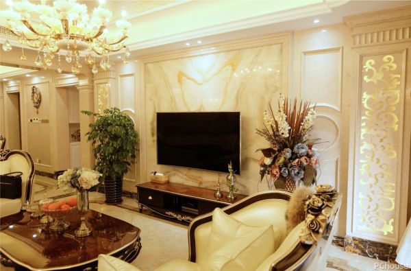 注重对称的空间美感,是欧式风格的特征之一。在客厅的布置中,处处体现着对称的空间美感。茶几与电视柜的对称、电视柜两旁的花卉的对称、背景墙两旁的装饰柱的对称、吊灯与茶几的对称……每一处的讲究合理、对称的比例,尽显空间的高贵优雅。