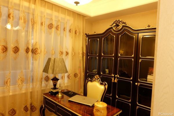 书房的设计,金黄色和棕色的配饰衬托出古典家具的高贵与优雅,赋予古典美感的窗帘和造型古朴的台灯,使整个空间看起来赋予韵律感,柔和的暖色光线给整个空间带来了柔美的气质,给人以开放、宽容的非凡气度,让人丝毫不显局促。