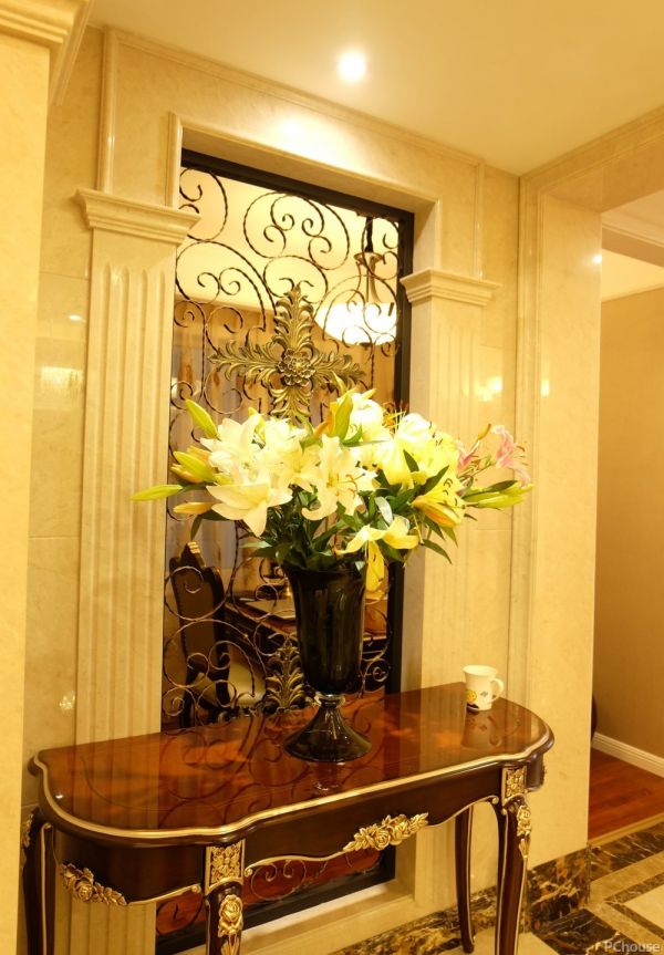就连拐角处的设计,都注重对称的美感。古典风韵的钩花窗、桌子边缘的金色浮雕花、对称的装饰柱,每一处都经过精心的设计,摆上一束盛开的鲜花,即使是拐角处,也让人流连忘返。