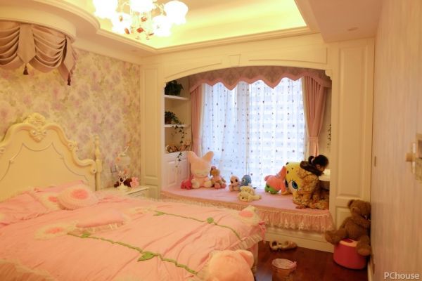 儿童房的设计,除了将欧式的高贵优雅之感表现出来外,还要营造一种温馨的童话氛围。通过完美的曲线,将欧式的风韵彰显出来;大量的粉色系窗帘、吊顶布帘、飘窗地毯,与粉色系的床单相得映彰,整个空间的温馨甜蜜之感洋溢而出。