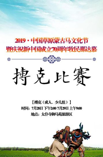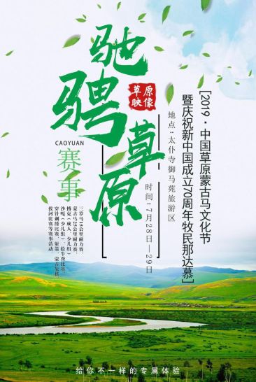 今夏七月的太仆寺旗贡宝拉格草原注定比以往更加不凡、璀璨,虽是一样的碧空如洗、白云如织,一样的辽阔翠绿、繁花点缀,一样的毡包如扣、牛羊散落,一样的淖尔潺潺、清风习习。也还是伴着那盛夏25度的清凉,随着祖国70年华诞的日益临近,23万太仆寺旗草原儿女即将于7月28日—30日在辽阔的贡宝拉格草原欢聚一堂、载歌载舞,隆重举办“2019·中国草原蒙古马文化节暨庆祝新中国成立70周年牧民那达慕”,进一步深入弘扬传承当代草原儿女“蒙古马”精神,共襄伟大祖国成立70周年盛世。