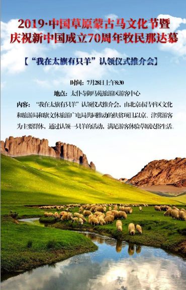 7月28日上午8:30在太仆寺御马苑旅游区游客中心准时开始。这是由北京市昌平区文化和旅游局和太旗文体旅游广电局共同打造旅游扶贫专项项目,旨在以京、津冀游客为主要群体,通过认领太旗贫困户一只羊活动,促进太旗文旅融合发展,带动太旗贫困农牧民增收。