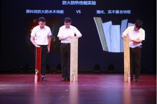 首发会现场,肯帝亚集团市场总监潘伟先生对这款黑科技新品做发布演讲,潘总讲述了肯帝亚集团研发防火防水木地板的历程,他讲道,当前市面上的实木、实木多层、强化地板都不具备防火、防水的功能,这也是地板材料的主要痛点,为破解困局,肯帝亚研发人员多年来潜心研发,筛选了大量的木种进行对比和实验,最终攻克难题找到了理想的基材材料与配方比,研发出这款耐火等级为A级(不燃性建筑材料)的防火防水木地板。