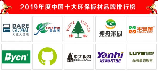 2019年中国十大环保板材品牌榜单已正式出炉:大亚人造板、露水河、伟业、神舟家园、平安树、Bycn、云猫、中大板材、沿海木业、神州绿野。